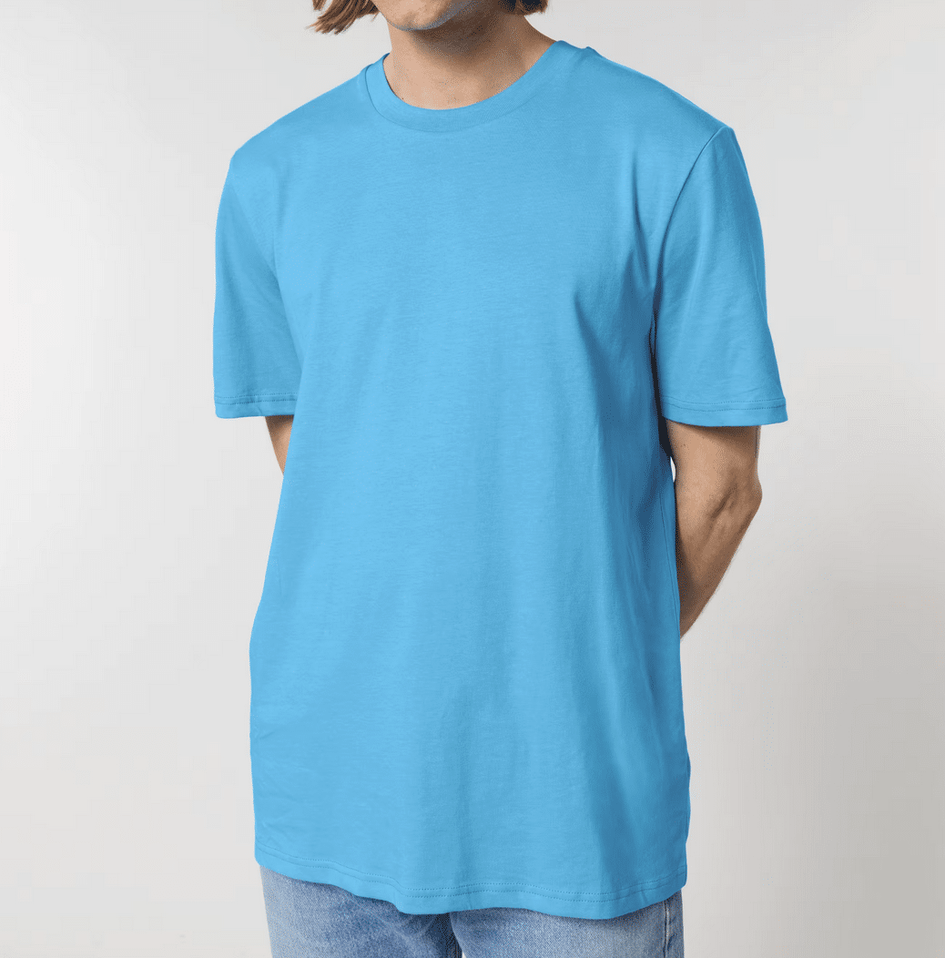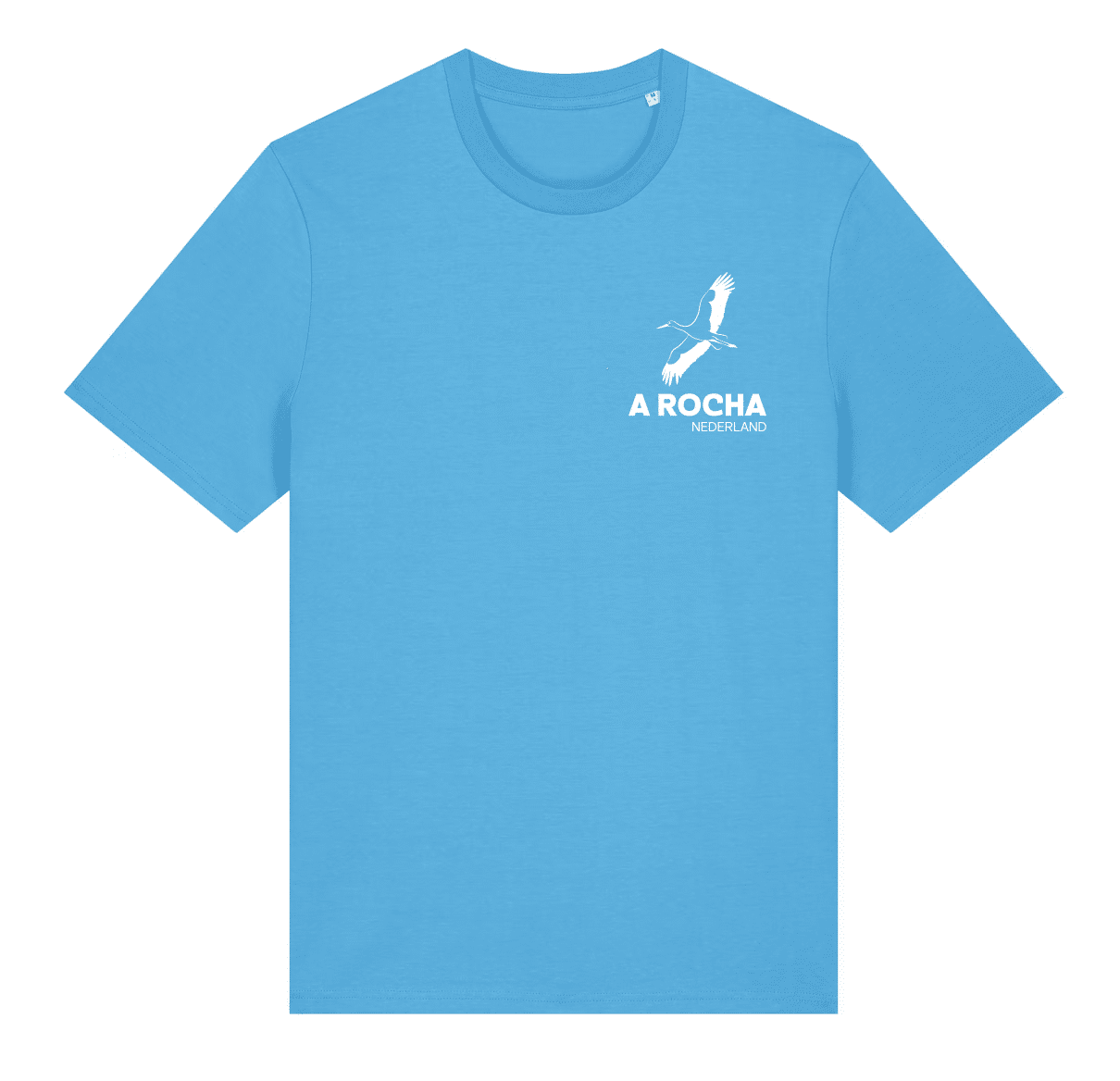 Stanley/Stella Creator 2.0 unisex T-shirt met A Rocha logo en wereldbol in kleur aqua blue. NB Dit is een unisex shirt, we verkopen ook een speciaal damesshirt.
